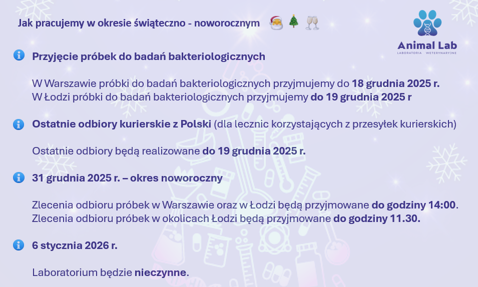 Jak pracujemy w okresie świątecznym Szanowni Państwo,uprzejmie informujemy o organizacji pracy laboratorium w nadchodzącym okresie świąteczno-noworocznym: • Przyjęcie próbek…